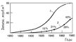 Изменение абсолютных и извлекаемых запасов нефти в США: 1 — общие геологические запасы; 2 — фактическая накопленная добыча (в % показаны средние значения коэффициента нефтеотдачи).