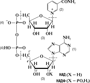 Во многих окислительно-восстановительных реакциях НАД или НАДФ присоединяют протон и 2 электрона, переносимые от окисляемого субстрата к окисленному коферменту; в обратной реакции водород переносится от восстановленного кофермента к субстрату. При этом водород отщепляется и присоединяется к атому углерода амида никотиновой кислоты в 4-м положении:
