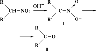 Алифатические Н. получают в промышленности главным образом нитрованием парафинов азотной кислотой или окислами азота. Простейшие мононитропарафины — бесцветные жидкости со своеобразным запахом. Нитро-парафины легко восстанавливаются до гидроксиламинов и аминов. При действии оснований первичные и вторичные Н. образуют соли аци-формы нитросоединений, т. н. изонитросоединений (I), легко превращающиеся в альдегиды или кетоны (II):