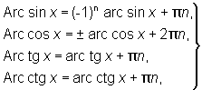 Так как тригонометрические функции периодические, то обратные к ним функции являются многозначными функциями. Определённые однозначные ветви (главные ветви) этих функций обозначаются так: arc sin х, arc cos x,..., arc cosec x. Именно, arc sin х есть та ветвь функции Arc sin х, для которой — p/2 £ arc sin х £ p/2. Аналогично, функции arc cos х, arc tg х и arc ctg х определяются из условий: 0 £ arc cos х £ p, — p/2 < arc tg x < p/2, 0 <arc ctg x < p. На рис. изображены графики функций у = Arc sin x, у = Arc cos x, у = Arc tg x, у = Arc ctg x; главные Arc cos x = ± arc cos x +2pn,ветви этих функций выделены жирной линией. О. т. ф. Arc sin х,... легко выражаются через arc sin x,..., например