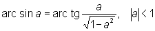 Обратные тригонометрические функции, аркфункции, круговые функции, решают следующую задачу: найти дугу (число) по заданному значению её тригонометрической функции. Шести основным тригонометрическим функциям соответствуют шесть О. т. ф.: 1) Arc sin х («арксинус x») — функция, обратная sin х; 2) Arc cos x («арккосинус x») — функция, обратная cos х; 3) Arc tg x («арктангенс x») — функция, обратная tg х; 4) Arc ctg x («арккотангенс x») — функция, обратная ctg x; 5) Arc sec x («арксеканс x») — функция, обратная sec x; 6) Arc cosec x («арккосеканс x») — функция, обратная cosec x. Согласно этим определениям, например, х = Arc sin a есть любое решение уравнения sin х = a, т.е. sin Arc sin a = a. Функции Arc sin x и Arc cos x определены (в действительной области) для |х| £ 1, функции Arc tg х и Arc ctg х — для всех действительных х, а функции Arc sec х и Arc cosec х:—для |х| ³ 1; две последние функции малоупотребительны.