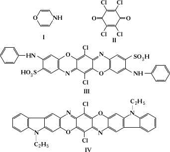 с ароматическими или гетероциклическими аминами. При получении прямых О. к. одновременно с конденсацией осуществляют сульфирование. Важные представители О. к. — прямой ярко-голубой светопрочный (III) и пигмент фиолетовый диоксазиновый (IV) — обладают высокой прочностью и применяются для окраски хлопчатобумажных тканей (III) и в качестве пигментов (IV).