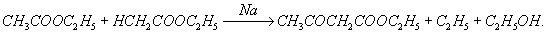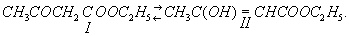 Ацетоуксусный эфир, органическое соединение, бесцветная жидкость с приятным запахом, температура кипения 181°С с частичным разложением; плотность 1028,2 кг/м3. А. э. содержит смеси кето-формы (1) и енольной формы (II). Обе формы находятся в состоянии равновесия, т. н. кето-енольной таутомерии: