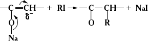 Влияние сопряжения проявляется и в тех случаях, когда два возможных направления реакции органических веществ не обусловлены таутомерией. Так, алкилирование натрийенолятов по атому углерода происходит вследствие перемещения реакционного центра благодаря сопряжению связей: