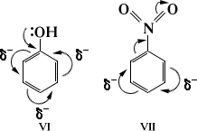 Взаимное влияние атомов в результате сопряжения связей проявляется также в ароматических соединениях (см. Ориентации правила). При электрофильном замещении электронодонорные (нуклеофильные) заместители (VI) ориентируют в орто- и пара-положения, электроноакцепторные (электрофильные) заместители (VII) — в мета-положение: