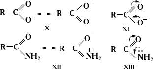 Этими же обозначениями пользуются для графической интерпретации равномерного распределения электронной плотности в симметричных ионах, например в карбоксилат-анионе (соответственно Х и XI), при объяснении слабоосновных свойств амидов кислот (XII и XIII) и в др. случаях: