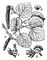 Осина: а — ветка с листьями, б — мужская серёжка, в — женская серёжка, г — пестичный цветок, д — тычиночный цветок, е — семя.