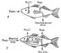 Осморегуляция у рыб: пресноводная рыба (1), морская костистая рыба (2); пунктиром обозначено движение воды по осмотическому градиенту. Пресноводные рыбы всасывают соли натрия жабрами; у морских костистых рыб клетки жаберного аппарата выделяют их. Почка морских рыб выделяет соли магния (сульфаты и др.), избыток которых поступает в организм рыб с пищей и морской водой.