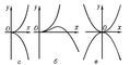 Если D > 0, то О. т. называется изолированной; например, у кривой у 2 — х 4 + 4x 2 = 0 начало координат есть изолированная О. т. (см. рис. 1). Если D < 0, то О. т. называется узловой, или точкой самопересечения; например, у кривой (x 2 + y 2 + a2)2 — 4a 2x 2 — a 4 = 0 начало координат есть узловая О. т. (см. рис. 2). Если D = 0, то О. т. кривой является либо изолированной, либо характеризуется тем, что различные ветви кривой имеют в этой точке общую касательную, например: а) точка возврата 1-го рода — различные ветви кривой расположены по разные стороны от общей касательной и образуют остриё, как у кривой у 2 — х 3 = 0 (см. рис. 3, a); б) точка возврата 2-го рода — различные ветви кривой расположены по одну сторону от общей касательной, как у кривой (у — x 2)2 — х 5 = 0 (см. рис. 3, б); в) точка самоприкосновения (для кривой у 2 — х 4 = 0 начало координат является точкой самоприкосновения; (см. рис. 3, в). Наряду с указанными О. т. имеется много других О. т. со специальными названиями; например, асимптотическая точка — вершина спирали с бесконечным числом витков (см. рис. 4), точка прекращения, угловая точка и т.д.