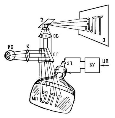Рис. 2. Схема устройства отображения с масляным модулятором света: ИС — источник света; К — конденсор; ОТ — отражатель; ОБ — объектив; З — зеркало; Э — экран; МП — масляная плёнка; ЭП — электронный прожектор; БУ — блок местного управления; ЦП — центральный процессор вычислительной системы.