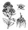 Очиток пурпуровый: а — верхняя часть растения; б — цветок; в — клубневидные корни.