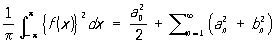 где a0, an, bn— коэффициенты Фурье функции f (x). Установлено в 1805 французским математиком М. Парсевалем (М. Parseval) при предположении о возможности почленного интегрирования тригонометрических рядов. В 1896 А. М. Ляпунов доказал, что это равенство справедливо, если функция ограничена в интервале (—p,p) и существует интеграл