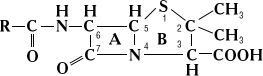 Пенициллины, группа близких по химическому строению природных и полусинтетических антибиотиков. Ядро молекулы П.— 6-аминопенициллановая кислота (6-АПК) — гетероциклическое соединение, состоящее из 4-членного b-лактамного (А) и 5-членного тиазолидинового (В) колец. П. различаются характером радикала (R) в боковой цепи.