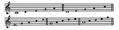 Пентатоника (от греч. pénte — пять и tónos — тон), звуковая система, содержащая пять ступеней в пределах октавы. Основной тип П.— бесполутоновая (ангемитонная, натуральная; также «китайская» или «шотландская» гамма). Её звуки могут быть расположены по чистым квинтам. В этом звукоряде между соседними ступенями возможны только два интервала — малая терция и большая секунда. Для П. характерны бесполутоновые трёхступенные попевки — трихорды (например, ми — соль — ля). Из-за отсутствия полутонов П. не свойственны острые ладовые тяготения. Звукоряд П. не выявляет определённого тонального центра, поэтому функции главного тона может выполнять любой из пяти звуков. Отсюда пять различных вариантов звукоряда П. при одном и том же звуковом составе: