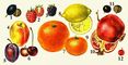 Апокарпные плоды: 1 — сочная однолистовка (воронец); 2—3 — многокостянка (2 — малина, 3 — ежевика); 4—6 — однокостянка (4 — персик, 5 — слива,6 — вишня); синкарпные плоды: 7—9 — померанец (7 — апельсин, 8 — лимон, 9 — мандарин); 10 — гранатина; 11 — верхняя синкарпная костянка (крушина); 12 — яблоко (рябина).