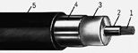 Подводные коаксиальные кабели для телефонно-телеграфной связи. Глубоководный: 1 — центральный несущий трос, скрученный из стальных проволок, 2 — внутренний трубчатый проводник из медной ленты со сварным швом, 3 — сплошная полиэтиленовая изоляция, 4 — внешний медный или алюминиевый проводник, 5 — полиэтиленовая оболочка.