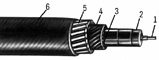 Подводные коаксиальные кабели для телефонно-телеграфной связи. Мелководный: 1 — внутренний медный проводник, 2 — сплошная полиэтиленовая изоляция, 3 — внешний проводник из медной ленты, 4 — слой пропитанной противогнилостным составом кабельной пряжи из джута, 5 — броня из круглых стальных проволок, 6 — слой джута, пропитанного противогнилостным составом.