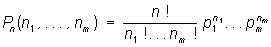 Полиномиальное распределение, мультиномиальное распределение, совместное распределение вероятностей случайных величин, каждая из которых есть число появлений одного из нескольких взаимно исключающих событий при повторных независимых испытаниях. Пусть при каждом испытании вероятности появления событий A1,..., Am равны соответственно p1,..., pm, причём 0 £ pk < 1, k = 1,..., m и p1 +... + pm = 1, тогда совместное распределение величин X1,..., Xm, где Xk — число появлений события Ak при n испытаниях, задаётся определёнными для любого набора целых неотрицательных чисел n1,..., nm, удовлетворяющих единственному условию n1 +... + nm = n, вероятностями