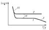 Рис. 5. Температурная зависимость концентрации n носителей тока в умеренно легированном (1) и сильно легированном (2) полупроводниках: I — область частичной ионизации примесей; II — область их полной ионизации; III — область собственной проводимости.