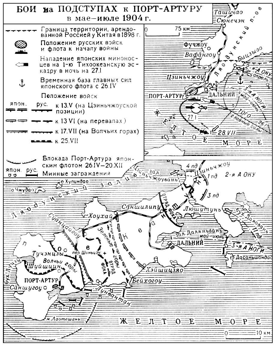 Порт-Артура оборона, героическая оборона крепости Порт-Артур 27 января (9 февраля) — 20 декабря 1904 (2 января 1905) во время русско-японской войны 1904—05. В 1898 царское правительство России арендовало на 25 лет часть Ляодунского полуострова (Квантунский полуостров) с Порт-Артуром (ныне Люйшунь). Строительство укреплений в Порт-Артуре (проект полковника К. И. Величко) из-за отсутствия средств началось только в 1901 (к январю 1904 на приморском направлении из 25 батарей было построено 9 долговременных и 12 временных; на сухопутном — из 6 фортов, 5 укреплений и 5 долговременных батарей были закончены лишь 1 форт, 3 укрепления и 3 батареи). Из 552 орудий в боевой готовности было 116. Гарнизон Квантунского полуострова состоял из 4-й и 7-й Вост.-Сибирских стрелковых дивизий. Начальник Квантунского укрепленного района был генерал-лейтенант А. М. Стессель, комендантом крепости — генерал-лейтенант К. Н. Смирнов, начальник сухопутной обороны — генерал-лейтенант Р. И. Кондратенко, явившийся организатором и вдохновителем П.-А. о. В Порт-Артуре к началу войны находилась 1-я Тихоокеанская эскадра под командованием вице-адмирала О. В. Старка [7 броненосцев, 9 крейсеров (в т. ч. 3 старых), 24 миноносца, 4 канонерские лодки, 2 минных заградителя, 2 минных крейсера]. В ночь на 27 января (9 февраля) 1904 10 японских миноносцев внезапно атаковали русскую эскадру, стоявшую из-за беспечности командования без охранения на открытом внешнем рейде, и повредили 2 броненосца и 1 крейсер. Утром к Порт-Артуру подошли главные силы японского флота под командованием адмирала Х. Того (6 броненосцев, 5 броненосных крейсеров, 4 крейсера), рассчитывая уничтожить ослабленную русскую эскадру, но под огнем её кораблей и береговых батарей вынуждены были отойти. 24 февраля (8 марта) прибыл новый командующий Тихоокеанским флотом вице-адмирал С. О. Макаров, принявший решительные меры по усилению обороны базы и повышению боевой активности эскадры. Но уже 31 марта (13 апреля) Макаров погиб. Пассивность принявшего командование эскадрой контр-адмирала В. К. Витгефта позволила японцам беспрепятственно начать 22 апреля (5 мая) в районе Бицзыво высадку 2-й армии генерала Я. Оку, которая, не встретив сопротивления, перерезала ж. д. на Порт-Артур, 13 (26) мая японские войска, благодаря значительному превосходству в силах (около 35 тыс. чел. против 3800 чел. у русских), захватили русские позиции на Цзиньчжоуском перешейке, прикрывавшие дальние подступы к Порт-Артуру. Русские войска отступили на позиции по линии залива Лунаантань, деревня Суанцайгоу. Опасаясь удара главных сил русской армии с С., противник оставил против Порт-Артура одну дивизию, а 3 передислоцировал на С. Направленный для поддержки Порт-Артура 1-й Сибирский корпус под командованием генерала Г. К. Штакельберга (около 30 тыс. чел.) из-за неумелого руководства потерпел поражение под Вафангоу 1—2 (14—15) июня. Для захвата Порт-Артура японцами была создана 3-я армия генерала М. Ноги, которая 13 (26) июня начала наступление и к 17 (30) июля вышла на ближние подступы к крепости, начав её осаду, К этому времени её гарнизон насчитывал около 50,5 тыс. чел. (из них 8 тыс. моряков), 646 орудий (в т. ч. 350 крепостных) и 62 пулемёта. Противник имел около 70 тыс. чел., около 400 орудий (в т. ч. 198 осадных) и 72 пулемёта. 28 июля (10 августа) русские корабли вновь предприняли попытку прорваться во Владивосток [первая попытка была п