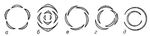 Рис. 3. Различные типы почкосложения: а — створчатое (листья соприкасаются краями); б — черепитчатое (листья прикрывают друг друга краями); в — прикрывающее, или скрученное (у каждого листа один край прикрыт краем соседнего листа); г — полуприкрывающее (из 5 листьев мутовки 2 не прикрыты, 2 прикрыты с обеих сторон, 1 с одной стороны прикрыт, а с другой — сам прикрывает соседний); д — объемлющее (каждый лист охватывает все листья, лежащие внутрь от него).