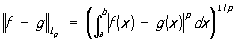 Для оценки близости исходной функции f и приближающей её функции g используются в зависимости от рассматриваемой задачи метрики различных функциональных пространств. Обычно это метрики пространств непрерывных функций С и функций, интегрируемых с р-й степенью, Lp, р ³ 1, в которых расстояние между функциями f и g определяется (для функций, заданных на отрезке [а, b]) по формулам