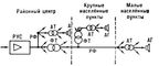 Рис. 2. Структурная схема районного (сельского) узла проводного вещания: РУС — усилительная станция районного узла; ФТ — понижающий фидерный трансформатор; РФ — распределительная фидерная линия; АТ — понижающий абонентский трансформатор; АГ — абонентский громкоговоритель.