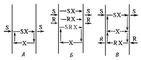 Рис. 2. Механизмы вторичной транслокации: S и R — субстраты, Х — переносчик; А — унипорт, Б — симпорт, В — антипорт.