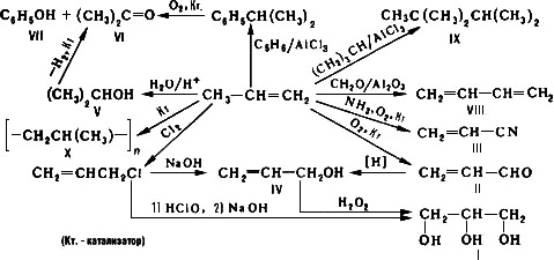 Взаимодействие П. с формальдегидом приводит к бутадиену (VIII), конденсация с изобутаном — к 2, 2,3-триметилбутану, или триптану (IX). Полимеризацией П. получают полипропилен (X). Продукты синтезов на основе П. широко используются для производства пластмасс, каучуков, моющих средств, компонентов моторных топлив, растворителей и др.