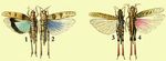 1 — голубокрылая кобылка (Oedipoda coerulescens); 2 — пустынница (Sphingonotus octofasciatus); 3 — мароккская саранча (Dociostaurus maroccanus); 4 — итальянский прус (Calliptamus italicus).
