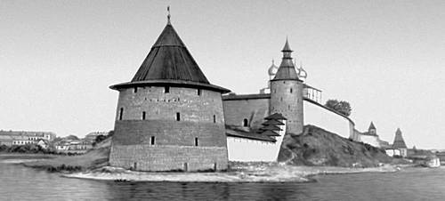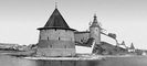 Псков. Вид на Кремль (Кром) в месте слияния рек Великой и Псковы. На первом плане Плоская башня у Нижних решеток (1500), на втором плане — башня Кутекрома (1400).