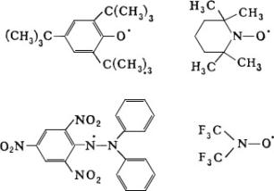 Известно большое число триарилметильных Р. с. К Р. с., стабильным благодаря пространственным явлениям, относятся продукты окисления замещенных фенолов, т. н. феноксильные Р. с., например три-трет-бутилфеноксил (1). Др. примеры долгоживущих Р. с. — дифенилпикрилгидразил (II), а также иминоксильные Р. с., апреля тетраметилпиперидиноксил (III) и бис-трифторметилнитроксил (IV):