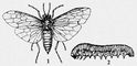 Рапсовый пилильщик: 1 — взрослое насекомое; 2 — личинка.