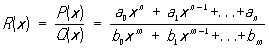 где a0, a1, ..., an и b0, b1, ..., bm (a0 ¹ 0, b0(0)— постоянные, a n и m — неотрицательные целые числа. Р. ф. определена и непрерывна для всех значений х, кроме тех, которые являются корнями знаменателя Q (x). Если x — корень кратности k знаменателя Q (x) и одновременно корень кратности r (r ³ k) числителя Р (х), то R (x) имеет в точке x устранимый разрыв; если же r < k, то R (x) имеет в точке x бесконечный разрыв (полюс). Многочлен является частным случаем Р. ф. (при m = 0), поэтому многочлены иногда называются целыми Р. ф.; всякая Р. ф. есть отношение двух многочленов. Др. примером Р. ф. может служить дробно-линейная функция.