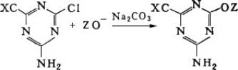 В молекулах Р. к. различают хромофорную систему (хромофор), благодаря которой Р. к. обладают ярким и интенсивным цветом, и реакционную группу, обеспечивающую химическую реакцию красителя с волокном. Промышленное применение уже получили Р. к. с самыми различными (более 25) реакционным группами. Часто в качестве реакционной группы служит моно- или дихлор-симм-триазин; тогда Р. к. вступает в реакцию замещения с ионизированной целлюлозой (ZO—) по схеме