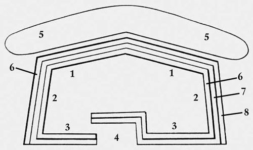 Редут: 1 — фронтовые (напольные) фасы; 2 — боковые фасы; 3 — горжа; 4 — прикрытый вход; 5 — гласис; 6 — внутренний ров (окоп для стрелков); 7 — бруствер; 8 — наружный ров.