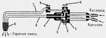 Ручной резак для кислородной резки: 1 — корпус; 2 и 9 — вентили для ацетилена и кислорода; 3 — инжектор; 4 — смесительная камера; 5 — трубка горючей смеси; 6 — наконечник; 7 — трубка режущего кислорода; 8 — вентиль для режущего кислорода.
