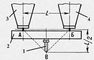 Рис. 2. Схема подвижной системы стереофонического рекордера: 1 — сапфировый резец; 2 — поперечная балка (при возбуждении правой части подвижной системы колебания резца происходят относительно точки А, а при возбуждении левой — относительно точки Б); 3 и 4 — левая и правая части подвижной системы, L — расстояние между ними; В — остриё резца.