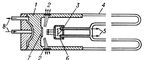 Рис. 2. Схема рентгеновской трубки для структурного анализа: 1 — металлический анодный стакан (обычно заземляется); 2 — окна из бериллия для выхода рентгеновского излучения; 3 — термоэмиссионный катод; 4 — стеклянная колба, изолирующая анодную часть трубки от катодной; 5 — выводы катода, к которым подводится напряжение накала, а также высокое (относительно анода) напряжение; 6 — электростатическая система фокусировки электронов; 7 — анод (антикатод); 8 — патрубки для ввода и вывода проточной воды, охлаждающей анодный стакан.