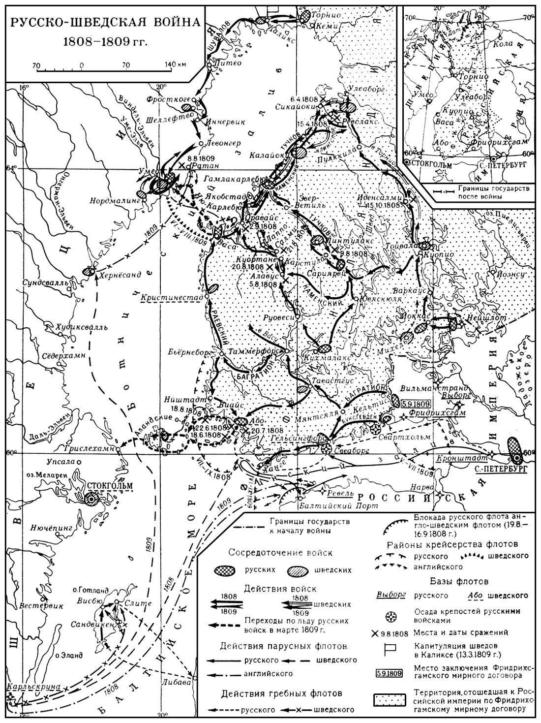 Русско-шведская война 1808—09, вызвана стремлением России в условиях начавшейся в 1807 войны с Великобританией установить полный контроль над Финским и Ботническим заливом в целях обеспечения безопасности Петербурга. Тильзитский мир 1807 поставил Швецию перед дилеммой: присоединиться, как и Россия, к континентальной блокаде и тем поставить под удар британского флота свою морскую торговлю и отказаться от английского рынка, либо сохранить традиционный союз с Великобританией и пойти на конфликт с Россией. Король Густав IV Адольф взял курс на разрыв с Россией, хотя Швеция не была готова к войне. Её силы, разбросанные по Финляндии, составляли всего 19 тыс. чел. 9 (21) февраля 1808 русские войска (24 тыс. чел.) под командованием генерала Ф. Ф. Буксгевдена перешли границу, в феврале заняли Тавастгус и осадили Свеаборг [капитулировал 21 апреля (3 мая)], в марте заняли Куопио, Таммерфорс, побережье между Або и Васой, Аландские острова, Якобстад, Гамлакарлебю. В апреле шведские войска (главнокомандующий фельдмаршал М. Клингспор) перешли в контрнаступление из района Улеаборга и нанесли поражение ослабленным русским войскам при Револаксе и Пулккила. В тылу русских войск развернулось партизанское движение финского населения, и они были вынуждены оставить северную и центральную часть Финляндии, а также Аландские острова и остров Готланд. Отошедшие на линию Бьёрнеборг — Таммерфорс — Санкт-Михель русские войска получили подкрепление (до 55 тыс. против 36 тыс. чел. у шведов), командиром центральной группы, действовавшей на главном направлении в районе Таммерфорса, был назначен генерал Н. М. Каменский, который получил задачу активными действиями разбить противника. 2 (14) августа 11-тыс. корпус Каменского перешёл в наступление и в сражениях при Куортане и Салми [20—21 августа (1—2 сентября)] и Оравайсе [2 (14) сентября] нанёс поражения главным силам шведов. Попытки шведского флота высадить десанты в районе Або были отражены отрядом П. И. Багратиона. Шведские войска отошли из Финляндии, финны прекратили боевые действия. В сентябре 1808 было заключено перемирие, но Александр I, подстрекаемый Наполеоном и стремившийся к полному разгрому Швеции, не утвердил перемирия и приказал новому (с декабря) главнокомандующему генералу Б. Ф. Кноррингу осуществить зимой вторжение в Швецию. План наступления был разработан Каменским и предусматривал движение тремя корпусами: одним по суше через Торнио и двумя по льду через Ботнический залив из Васы на Умео и из Або через Аландские острова в район севернее Стокгольма. Кнорринг считал этот план нереальным и медлил с его выполнением. Прибывший в армию Александр I приказал начать наступление. 5 (17) марта корпус Багратиона (17 тыс. чел.) занял Аландские острова, после чего отряд генерал-майора Я. П. Кульнева 7 (19) марта достиг шведские берега и занял Грислехамн. Корпус генерала М. Б. Барклая-де-Толли (5 тыс. чел.) 4 (16) марта выступил из Васы, с большими трудностями преодолел пролив Кваркен и 12 (24) марта занял Умео. Корпус генерала П. А. Шувалова (4 тыс. чел.), наступая в сильный мороз через Торнио, настиг шведские войска у Каликса и вынудил их 13 (25) марта капитулировать. Между тем в Швеции произошёл государственный переворот, король был свергнут и регентом стал герцог Зюдерманландский (впоследствии Карл XIII), который предложил начать мирные переговоры. Находив