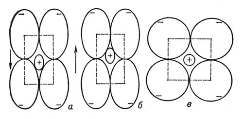 Рис. 2. Схематическое изображение элементарной ячейки сегнетоэлектрика в полярной фазе (а и б) и в неполярной фазе (в); стрелки указывают направление электрических дипольных моментов.