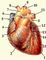 Сердце, вид сзади: 1 — верхушка сердца; 2 — левый желудочек; 3 — венечная пазуха сердца; 4 — левое ушко; 5 — левые лёгочные вены; 6 — перикард (отрезан); 7 — правая и левая лёгочные артерии; 8 — дуга аорты; 9 — верхняя полая вена; 10 — правые лёгочные вены; 11 — левое предсердие; 12 — правое предсердие; 13 — нижняя полая вена; 14 — правая венечная артерия; 15 — задняя межжелудочковая ветвь; 16 — правый желудочек.