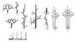 Симподий: 1 — дихотомическое ветвление; 2 — симподий, возникший из неравной дихотомии; 3 — ложная дихотомия, или дихазий, — симподиальная система ветвей с отмирающими верхушками при супротивном листорасположении; 4 — симподиально растущая ветвь — монохазий (симподий составлен осями 4 порядков); 5 — моноподий (для сравнения), главная ось одного порядка; 6 — симподиально растущий корень; 7 — ствол дерева — симподий (цифрами обозначены отмершие верхушки осей последовательных порядков); 8 — дерево с моноподиальным стволом (для сравнения); цифры — границы годичных приростов оси единственного порядка; 9 — образование симподиального корневища травянистого растения (римские цифры — порядки осей).