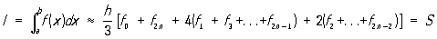 где h = (b — а)/2n; fi, = f (a + ih), i = 0, 1, 2,..., 2n. С. ф. называют иногда формулой парабол, т. к. вывод этой формулы основан на замене подынтегральной функции f (x) на каждом из отрезков [a + 2hk, а + 2h (k + 1)], k = 0, 1,..., n — 1, соответствующим интерполяционным многочленом второй степени (см. Интерполяционные формулы); геометрически это означает, что кривая, описываемая уравнением у = f (x), заменяется близкой к ней кривой, состоящей из отрезков парабол. Погрешность, возникающая в результате применения С. ф., равна