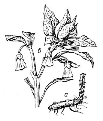 Скополия карниолийская: а — корневище; б — верхняя часть растения.