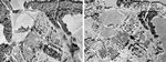 Аэроснимки с натуральным (цветные) и преобразованным (спектрозональные) цветовоспроизведением местности, полученные в летнее время. Аэроснимки одного и того же всхолмленного участка в полосе смешанных лесов; видны небольшой населенный пункт, перелески, поля и др. На цветном аэроснимке (слева) дома распознаются уверенно, древостои по породам на разделяются, посевы мало дифференцируются. На спектральном аэроснимке (справа) дома распознаются не полностью, древостои разделяются благодаря условной цветопередаче (сосняки — темно-зеленые, дубравы — желто-коричневые), посевы дифференцируются.
