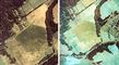 Аэроснимки одного и того же участка местности: слева — обычный, справа — инфрахроматический. На рисунке справа деревья четко разделены на хвойные (более тёмные) и лиственные (светлые), тёмное пятно в центре — водоём, который на обычном снимке сливается с общим фоном.