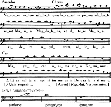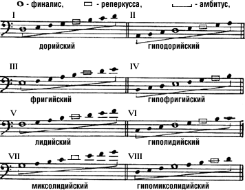 Основные категории С. л. — финалис (конечный тон), амбитус (объём звукоряда) и (в мелодиях, связанных с псалмодированием) реперкусса (тон повторения, псалмодирования, в нотных примерах обозначен белой нотой в середине звукоряда). Каждый из С. л. обладал своими характерными мелодическими формулами-попевками. Пример мелодии в одном из С. л.: