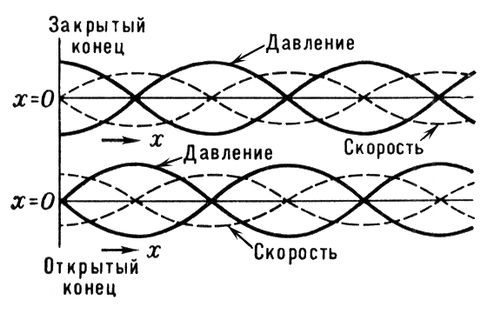 Распределение давлений и скоростей в стоячей волне при открытом и закрытом конце трубы.