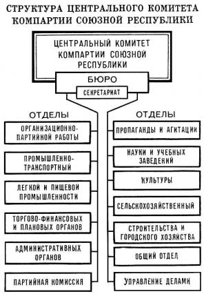 Примечание. В ряде ЦК КП союзных республик имеются отделы по наиболее развитым в республике отраслям промышленности и сельского хозяйства (тяжёлой, химической промышленности, машиностроения, водного хозяйства и др.). В некоторых ЦК вместо отдела торгово-финансовых и плановых органов имеется отдел торговли и бытового обслуживания.